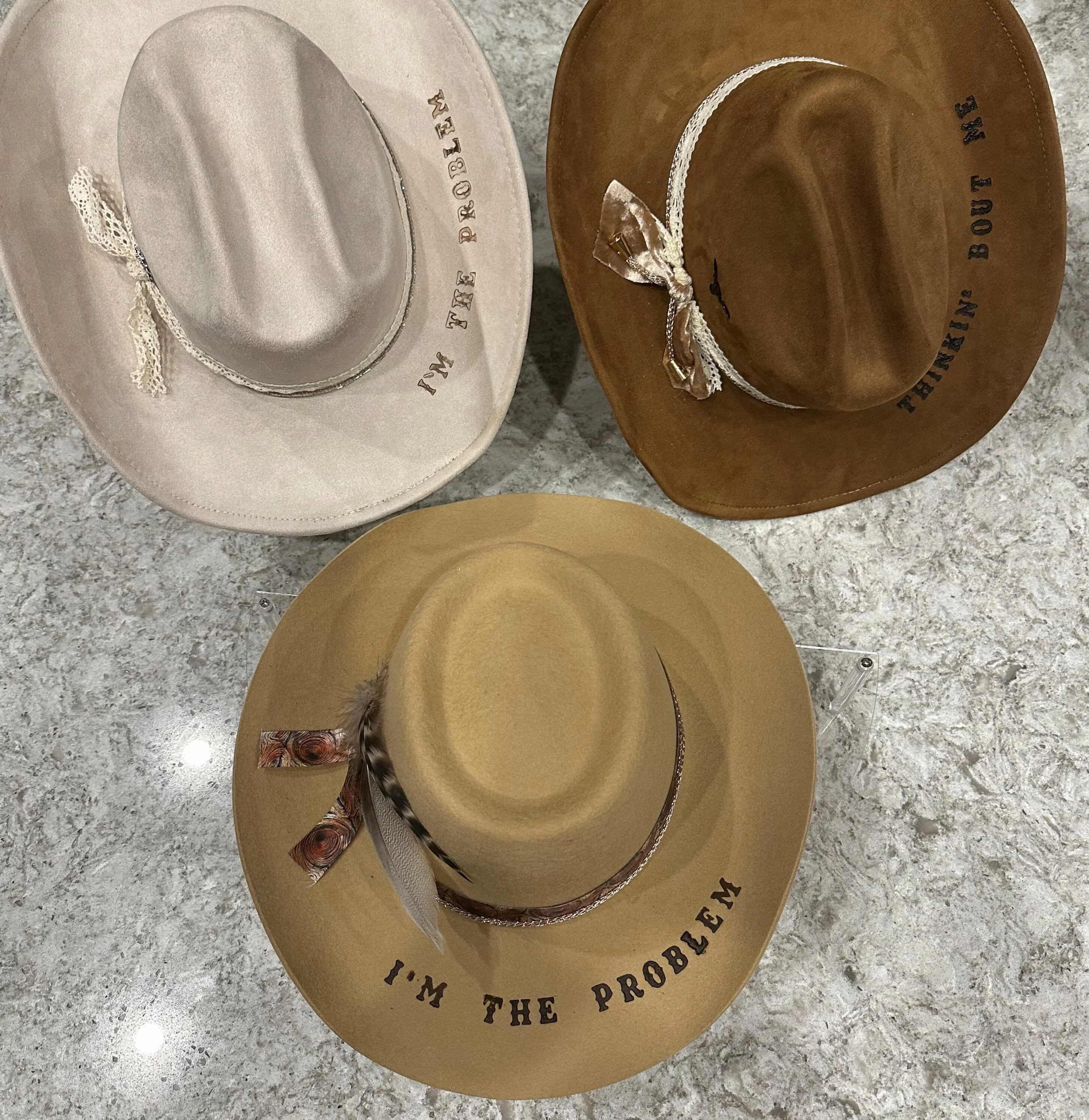 You will select from a range of hat styles, colours and sizes, from flat brim to traditional western hats, we have something for everyone. First, select the hat, then accessorize with a variety of bands, charms, feathers, and more to create a one-of-a-kind piece.